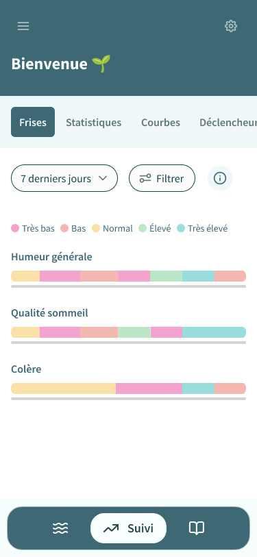 Chaque jour, notez simplement vos ressentis. Visualisez vos évolutions et prenez conscience des variations de votre état au fil du temps.