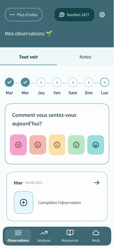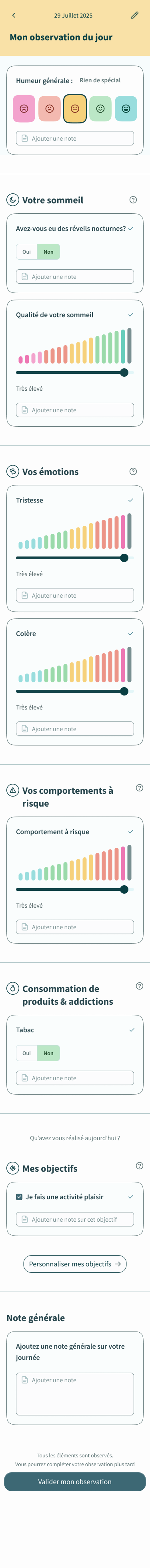 Choisissez les indicateurs qui comptent pour vous (humeur, sommeil, anxiété, énergie…), et personnalisez votre observation quotidienne en fonction de vos besoins.