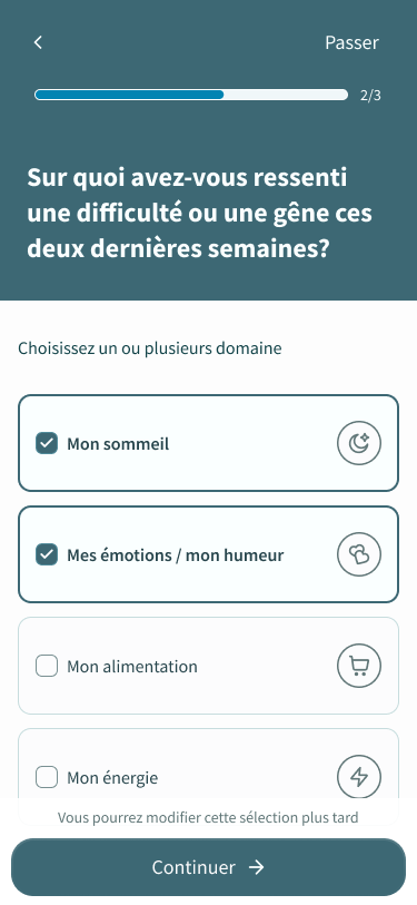Un questionnaire personnalisé pour suivre ses ressentis, ses comportements, ses symptômes ou ses traitements.